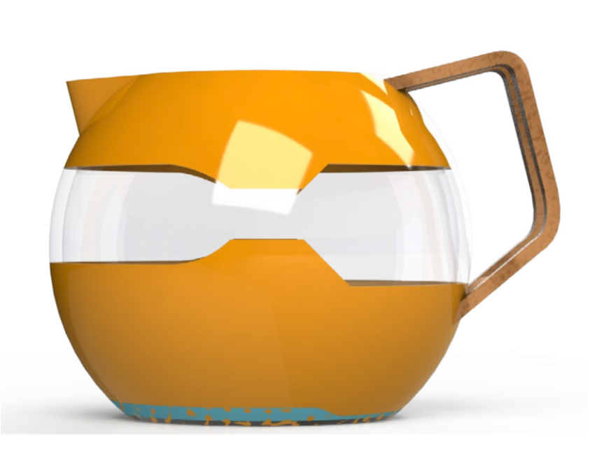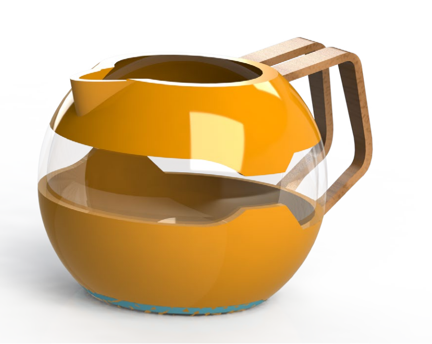 De vormgeving is geinspireerd op de BMW i3, de algehele vorm van de auto is omgeven door een niet contstante ruit, deze heb ik gebruikt in de theepot omdat dit de auto maakt wat deze is. Het handvat is geinspireerd op het dashboard, deze is van gebogen hout voor een modern, fris en milieuvriendelijk uiterlijk. Aan de onderkant van de theepot zit een blauw accent, dit was bij sommige van de concept cars van de BMW i3 ook zo en deze tilt het product van de grond met een subtiel detail.